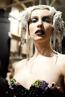 Characters as loud as the clothes stormed the catwalk proud of their individuality. To say Ziad’s choice of models was controversial would be an understatement; boys as girls, transgender, a possessed ballet dancer, vamps, a large lady, freaky girls – ‘what of it’ was their attitude. The make-up added even more drama to the show, as if there wasn’t enough already. Ziad told me backstage that he had asked all of his models to decide on their favourite horror film make-up and that is what they wore. The majority chose white faces, wicked black grins and hollow eyes. Taking a closer look at the garments away from the excitement of the make-up and models, there is even more to appreciate. Ziad puts so much into his collection, from the styling and the show to the design process. He used vintage silk chiffon for the free flowing gowns as well as Moroccan crepe from old couture mills. The light flow of the chiffon was beautifully displayed by a possessed ballet dancer who walked the catwalk on her points spinning as she went with the chiffon of her dress fluttering in her path. Paying homage to couturiers of the past Ziad wanted to compliment the female form in his collection, showcasing a ‘feminine and sensual silhouette’; corsetry, ruffled crepe, veils and delicate brocade illustrated this. Black lace and heavily embellished pieces added a little darkness to the collection. Ziad excelled himself; there was not one person in the room who did not gasp throughout the show.