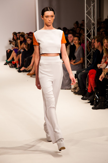 Excitement doesn't quite cover the sensation surrounding the Spring Summer 2012 collection from Georgia Hardinge. Backstage, Georgia is like a bubble of energy about to burst. The Vauxhall Fashion Scout veteran (Ones To Watch SS11, Merit Award AW11) returned to Freemasons Hall for a third time with her cubo-futurist inspired collection. The designer once again fulfilled her signature ethos that “the highest approach of art awareness is through fashion” by encompassing her signature linear creations; only this time traversing a two dimensional angle. Brother of Marcel; sculptor Raymond Duchamp-Villons dark vision instigated and incepted the mind of the Parsons alum and carried her directly into the straight talking fractured vectors and cuboid fronted mini-skirts designed for the modern day woman.