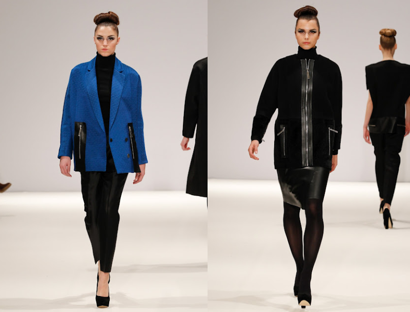 Heohwan Simultion kicked off the Ones to Watch show with an utterly modern collection that had the crowd wowed from the start. Oversized coats and masculine tailored jackets were paired with feminine drainpipe trousers and pencil skirts, an almost unsurprising feature from a designer who studied menswear at the RCA. The black, orange and cobalt blue colour palette really made this collection pop and the crowd, who included Susie Lau and Kate Nash, lapped up the zip-through backs, extended shoulders and leather panelling. Plastic geometric shapes dangled from dresses for a funky touch in this collection perfect for city-slickers. After the show, the designer, Hwan Heo, still buzzing on adrenaline, exclaimed: “Thank you for having me!”