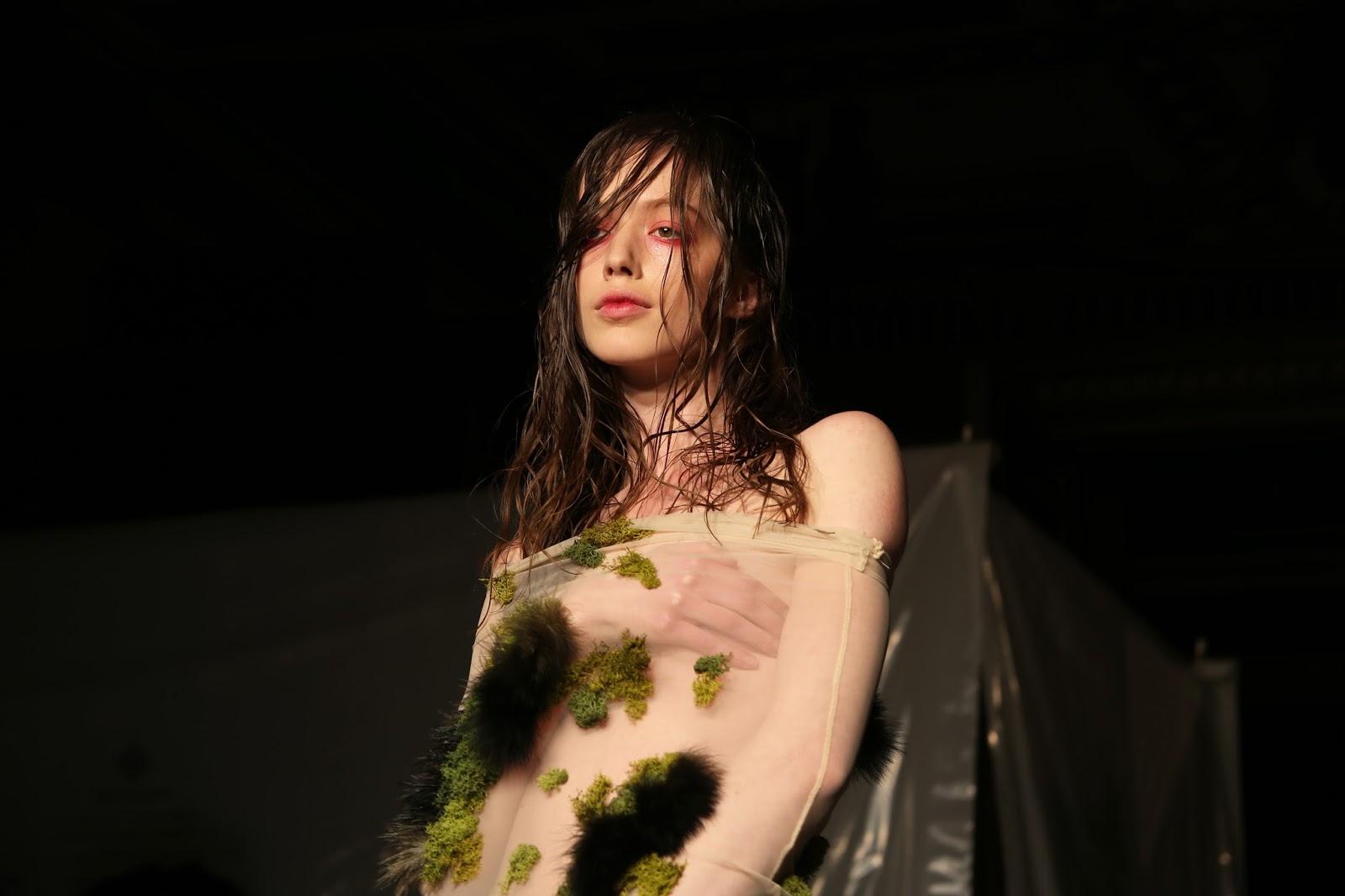 Alva Johnson challenged the traditional conventions of fashion with her displaced garments in earthy tones draping off the models bodies. Her 'Bodydressed' collection used bodystockings to contrast with the undressed feel of her garments.